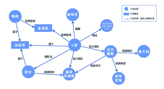 实体指的是现实世界中的事物比如人名、地名、机构等。概念指的是具有同种特性的实体构成的集合,如下图中的“运动员”、“金球奖”等。关系则用来表达不同实体之间的某种联系。