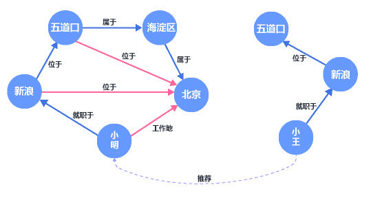 以小明为例,小明就职于位于五道口的新浪,系统可以推测出小明在北京工作。并将同样在北京新浪工作的小王推荐给了他。在下图中,蓝色的箭头表示表示已存在的关系,红色箭头为知识图谱补全后的关系。