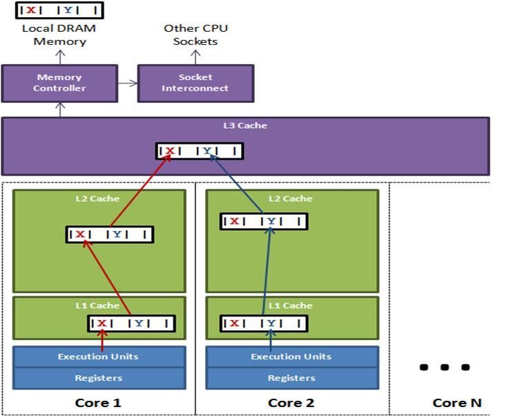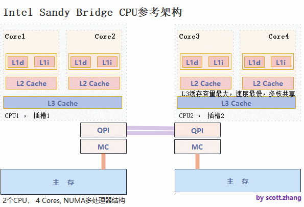 计算机早已进入多核时代,软件也运行在多核环境。一个处理器对应一个物理插槽、包含多个核(一个核包含寄存器、L1 Cache、L2 Cache),多核间共享L3 Cache,多处理器间通过QPI总线相连。