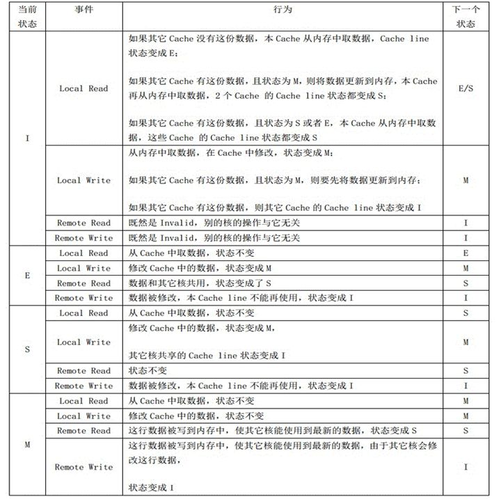 - 对于M和E状态而言总是精确的,和该缓存行的真正状态是一致的。而S状态可能是非一致的,如果一个缓存将处于S状态的缓存行作废了,而另一个缓存实际上可能已经独享了该缓存行,但是该缓存却不会将该缓存行升迁为E状态,是因为其它缓存不会广播作废掉该缓存行的通知,同样,由于缓存并没有保存该缓存行的copy的数量,因此也没有办法确定自己是否已经独享了该缓存行。
