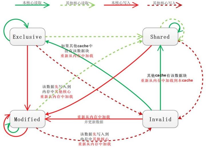 譬如,当前核心要读取的数据块在其核心的cache状态为Invalid,在其他核心上存在且状态为Modified的情况。可以从当前核心和其它核心两个角度观察,其它核心角度:当前状态为Modified,其它核心想读这个数据块(图中Modified到Shared的绿色虚线):先把改变后的数据写入到内存中(先于其它核心的读),并更新该cache状态为Share.当前核心角度:当前状态为Invalid,想读这个数据块(图中Invalid到Shared的绿色实线):这种情况下会从内存中重新加载,并更新该cache状态Share