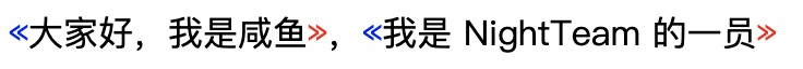 <q>大家好,我是咸鱼</q>,<q>我是 NightTeam 的一员</q>