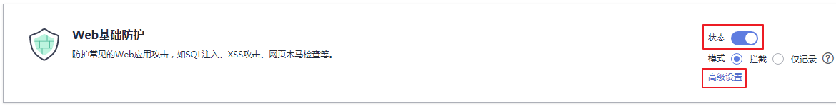 步骤2 :在“Web基础防护”配置框,开启Web基础防护后,单击“高级设置”。