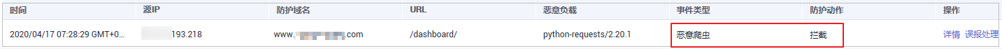当WAF检测到恶意爬虫、扫描器等对网站进行爬取时,将立即拦截并记录该事件,您可以在“防护事件”页面查看爬虫防护日志。