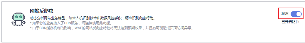 步骤2 :在“网站反爬虫”配置框,开启防护。