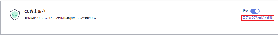 步骤2 : 在“CC攻击防护”配置框,开启防护后,单击“自定义CC攻击防护规则”。