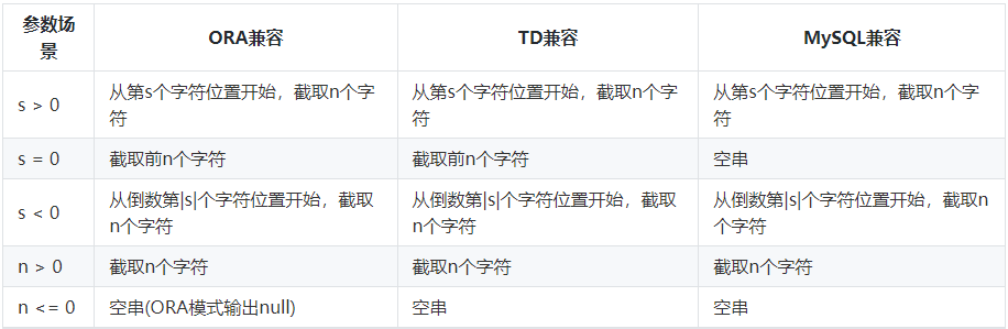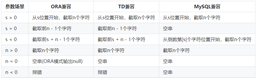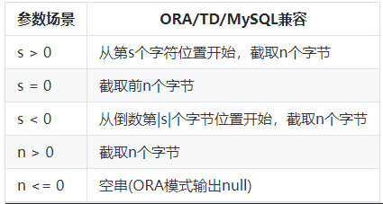 substring(string, s[, n]):s<=0和n<0时存在兼容行为差异