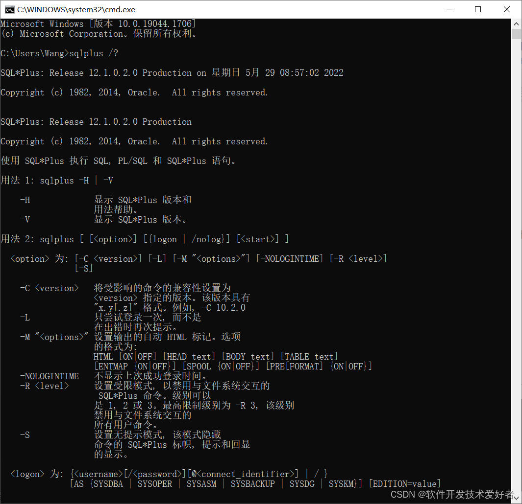 先看一下sqlplus命令帮助,win+r键打开cmd,输入命令