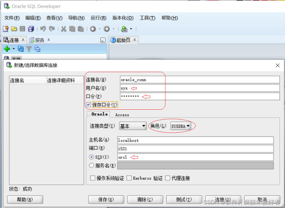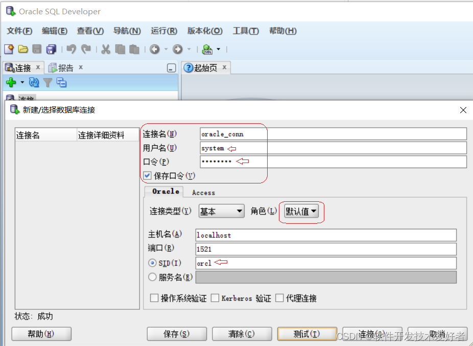 在该对话框的“连接名”文本框中输入你想要的名称(我这里是oracal_conn),在“用户名”文本框中输入“SYSTEM”(我这里是以“SYSTEM”用户身份连接orcl数据库),在“口令”输入正确的密码,选择复选框“保存口令”,在“SID”文本框中输入“orcl”,其它按默认,然后单击【测试】按钮,若显示的状态为“成功”,就可以单击【连接】按钮