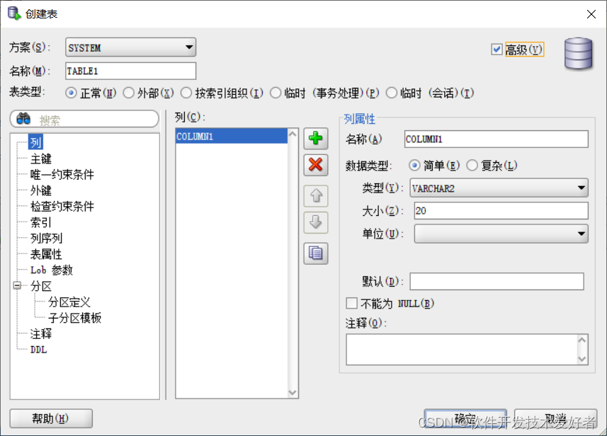选中右上角“高级”复选框,这时会显示出更多的表选项,如表类型、列的默认值、约束条件、外键和存储选项等,如下图: