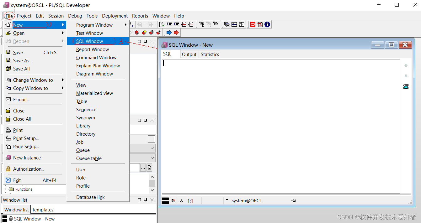 现在可以正常登录,File → New → SQL Window,打开SQL Window,参见下图: