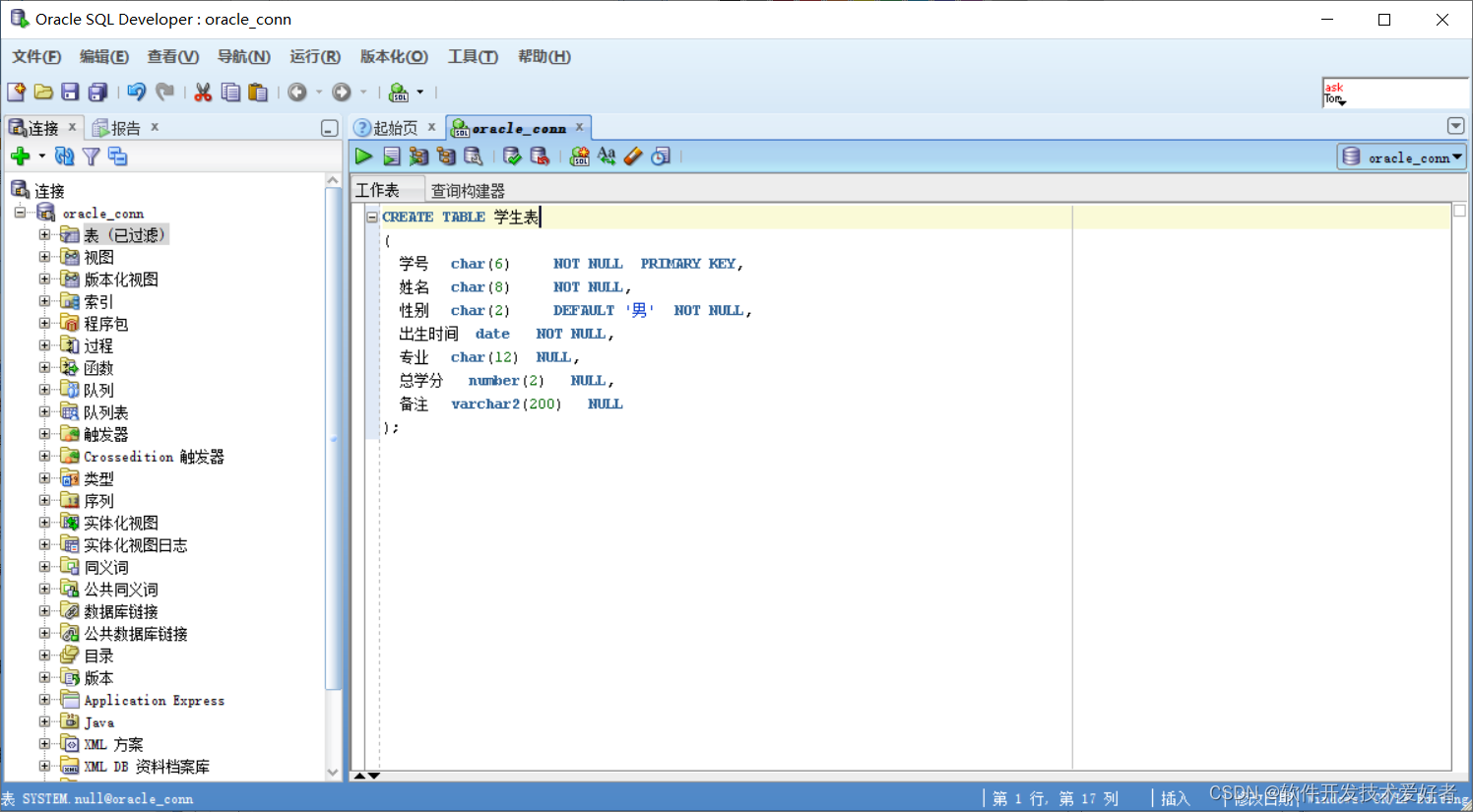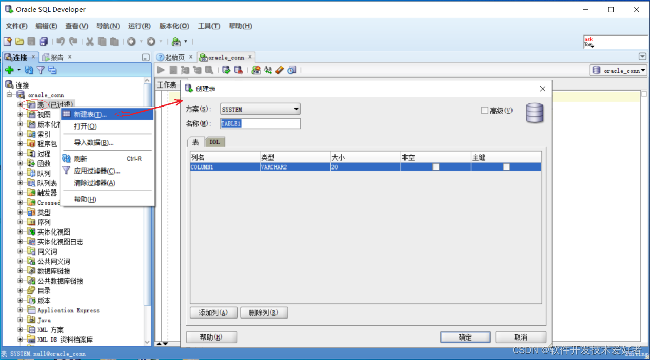 1)启动SQL Developer,在“连接”节点下打开数据库连接我这里是oracle_conn。右击“表”节点,选择“新建表”菜单项。