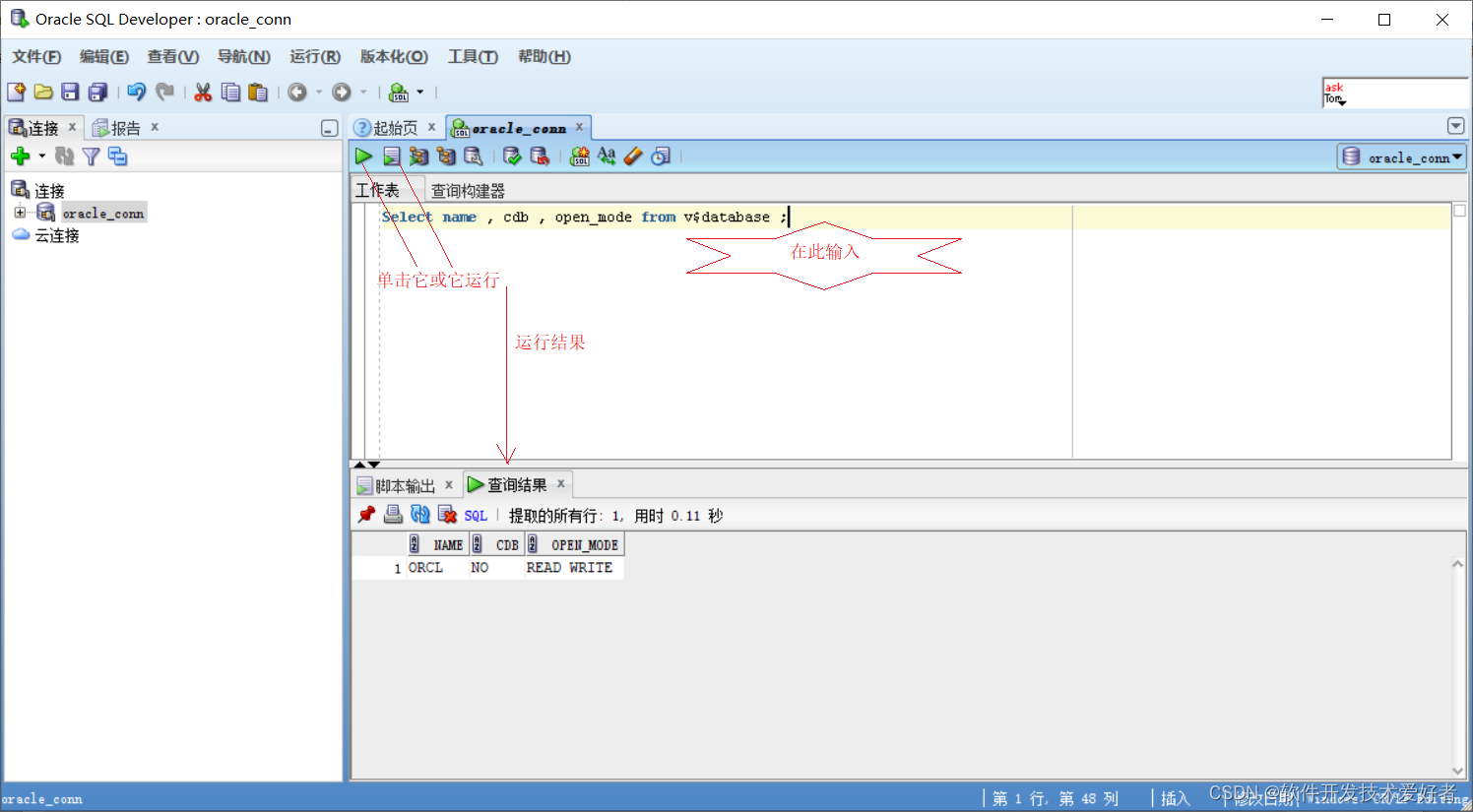 在SQL Window中输入一个SQL查询语句如select name , cdb , open_mode from v$database ,若执行结果正常的话就表示已经成功连接上数据库,可以使用了,参见下图: