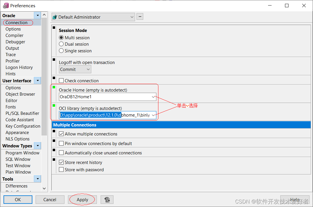 进入PL/SQL Developer主界面后,点击 菜单Tools(工具) → preferences(首选项) → connection(连接) 配置 oracle主目录 和 OCI库,参见下图: