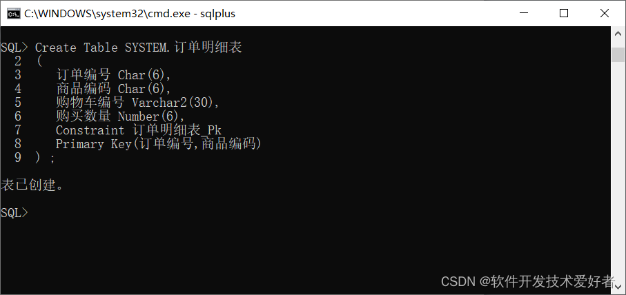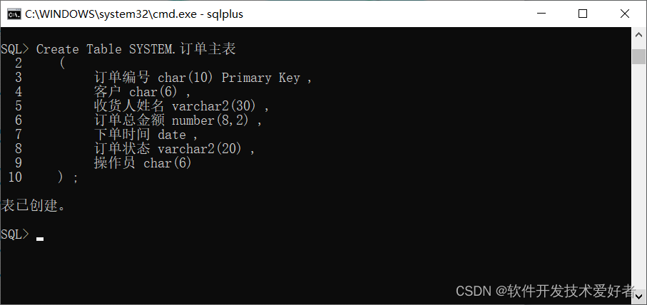 在提示符“SQL>”后输入创建“订单主表”数据表的命令: