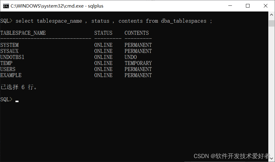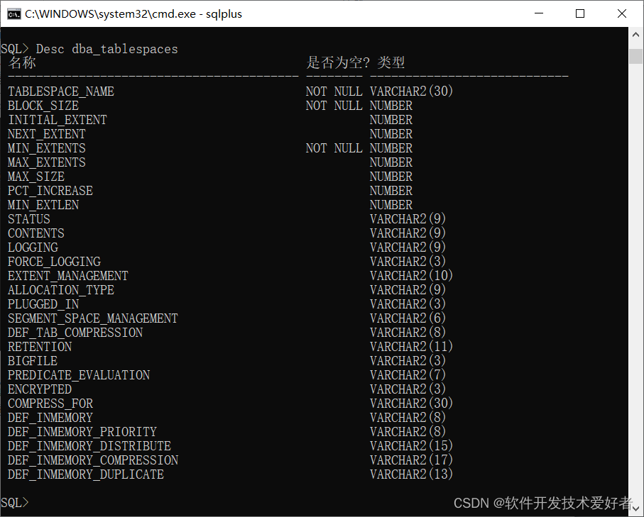 输入以下命令查看数据字典dba_tablespaces的结构信息: