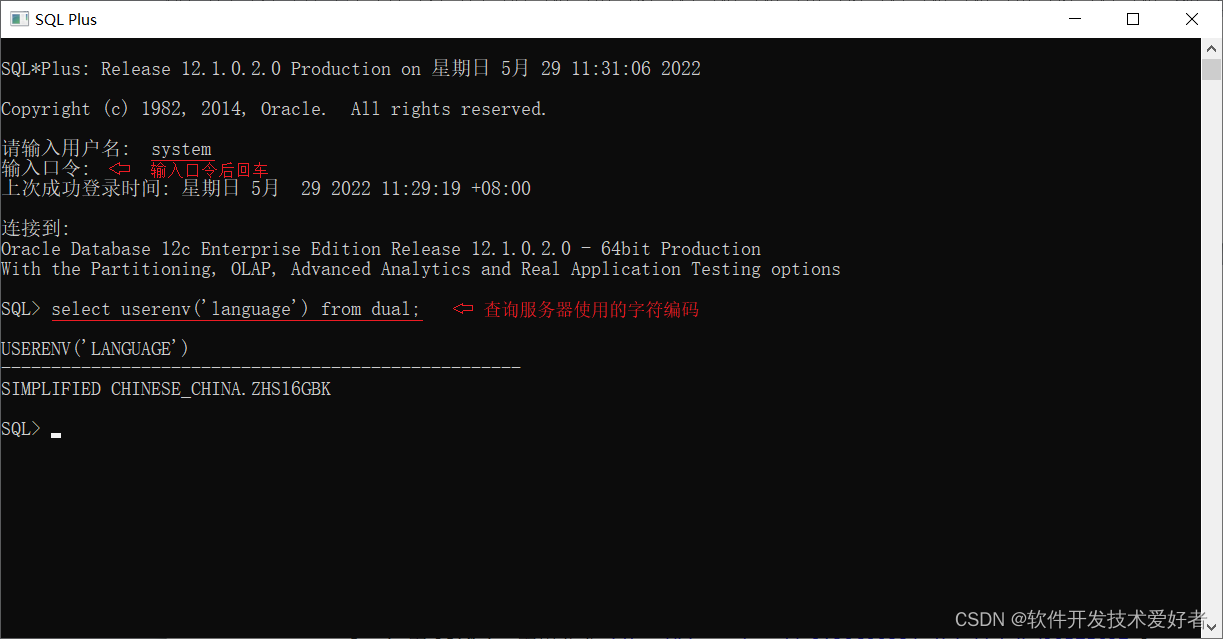 提示:命令关键字不区分大小写(比如,输入 sqlplus 或 SQLPLUS 都可以),但参数区分大小写。