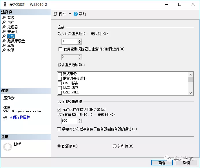 在服务器配置选项中,我们能通过“最大并行度”、“并行的开销阈值”两个配置进行调整,最大并行度的默认值是0,即不限制并行度,最大能使用到与CPU核数相等的并行度。但是对于明显有性能问题的系统,则需要考虑调整这个高级选项进行优化: