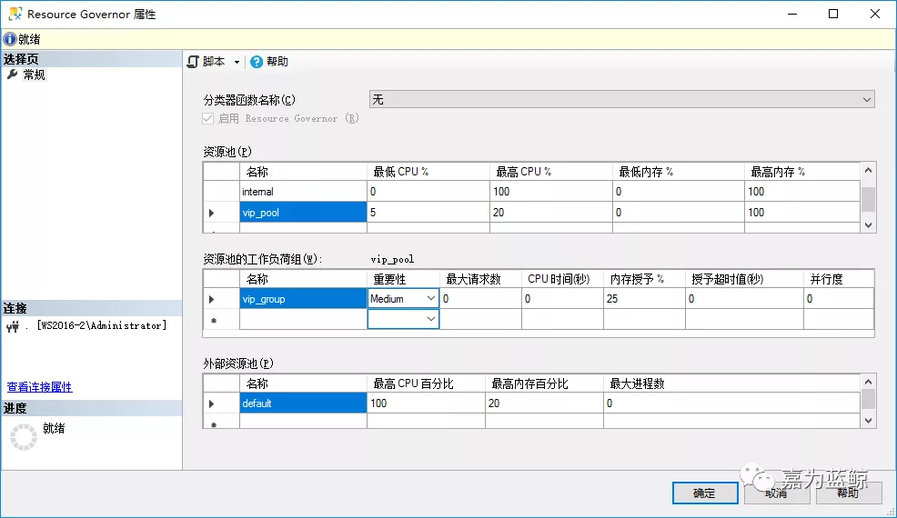 新建分类器函数(此处指定了登录名vip的会话,将路由到工作负荷组vip_group,其余会话都将在默认的default组)