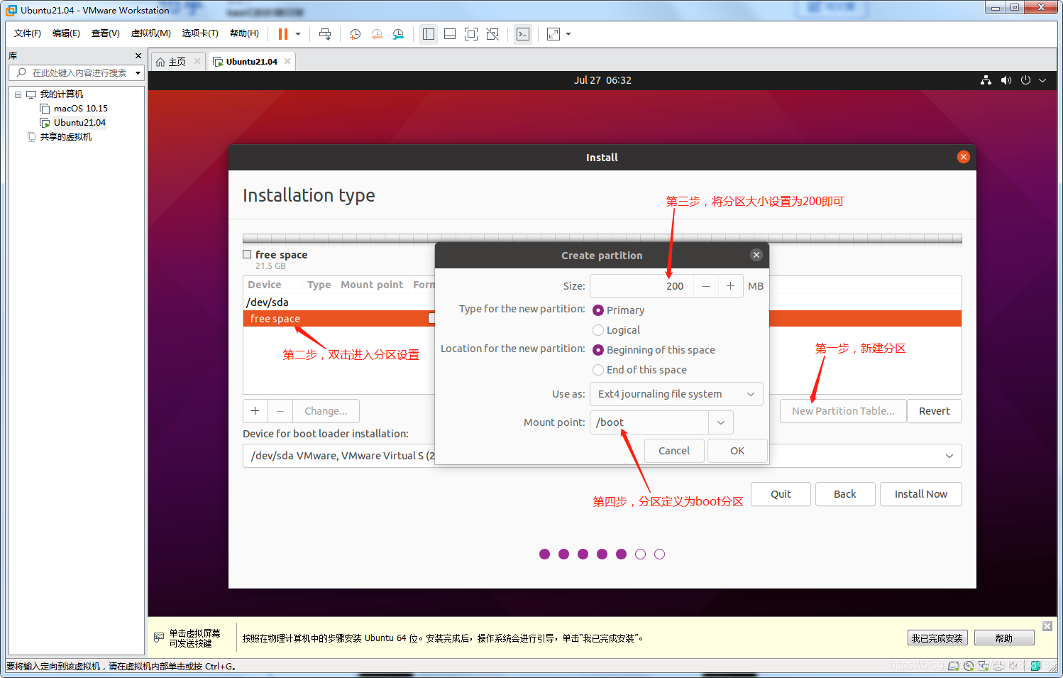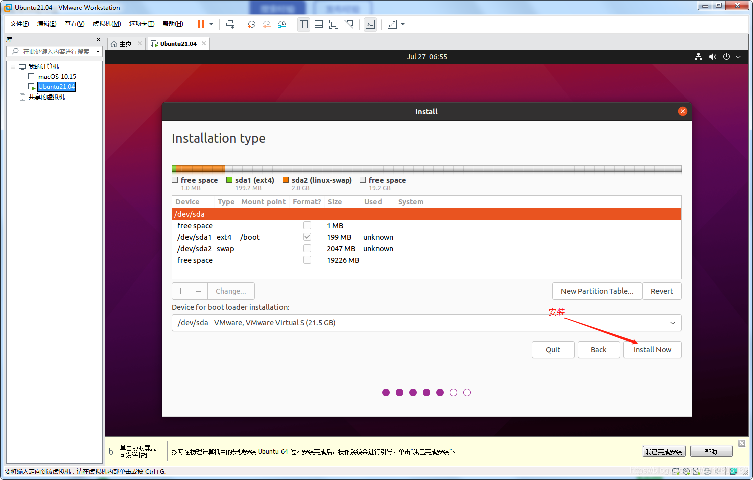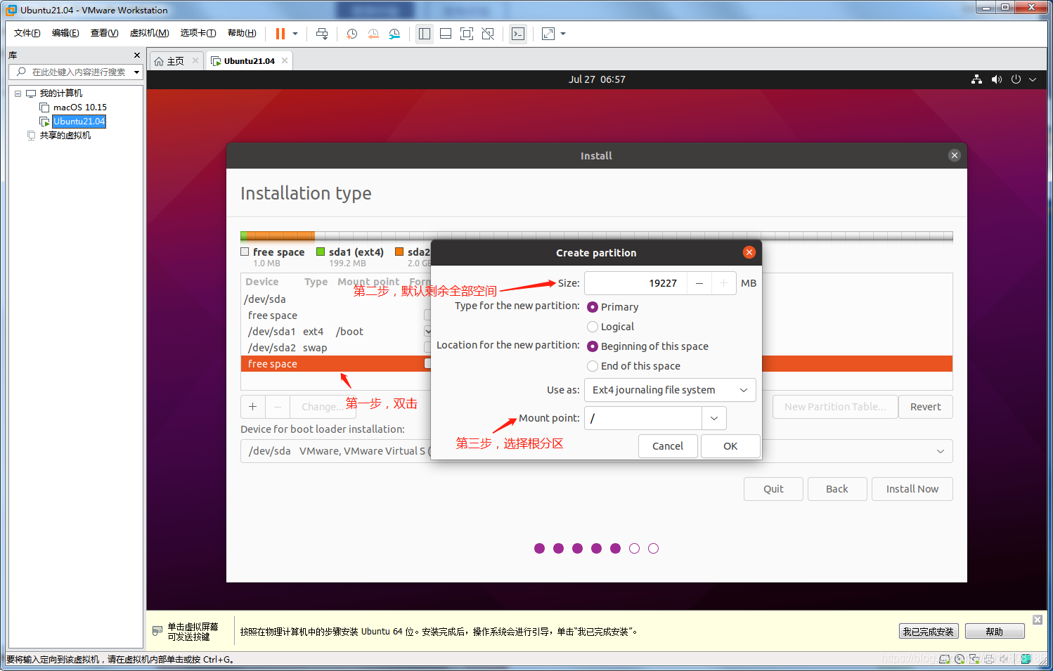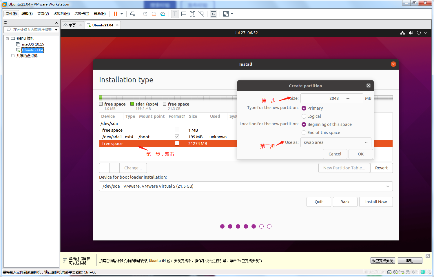 PS:swap分区的大小设置为我们虚拟机给ubuntu设置的内存大小即可,我们这里虚拟机给ubuntu设置的内存大小为2G,所以swap分区的大小也设置为2G。
