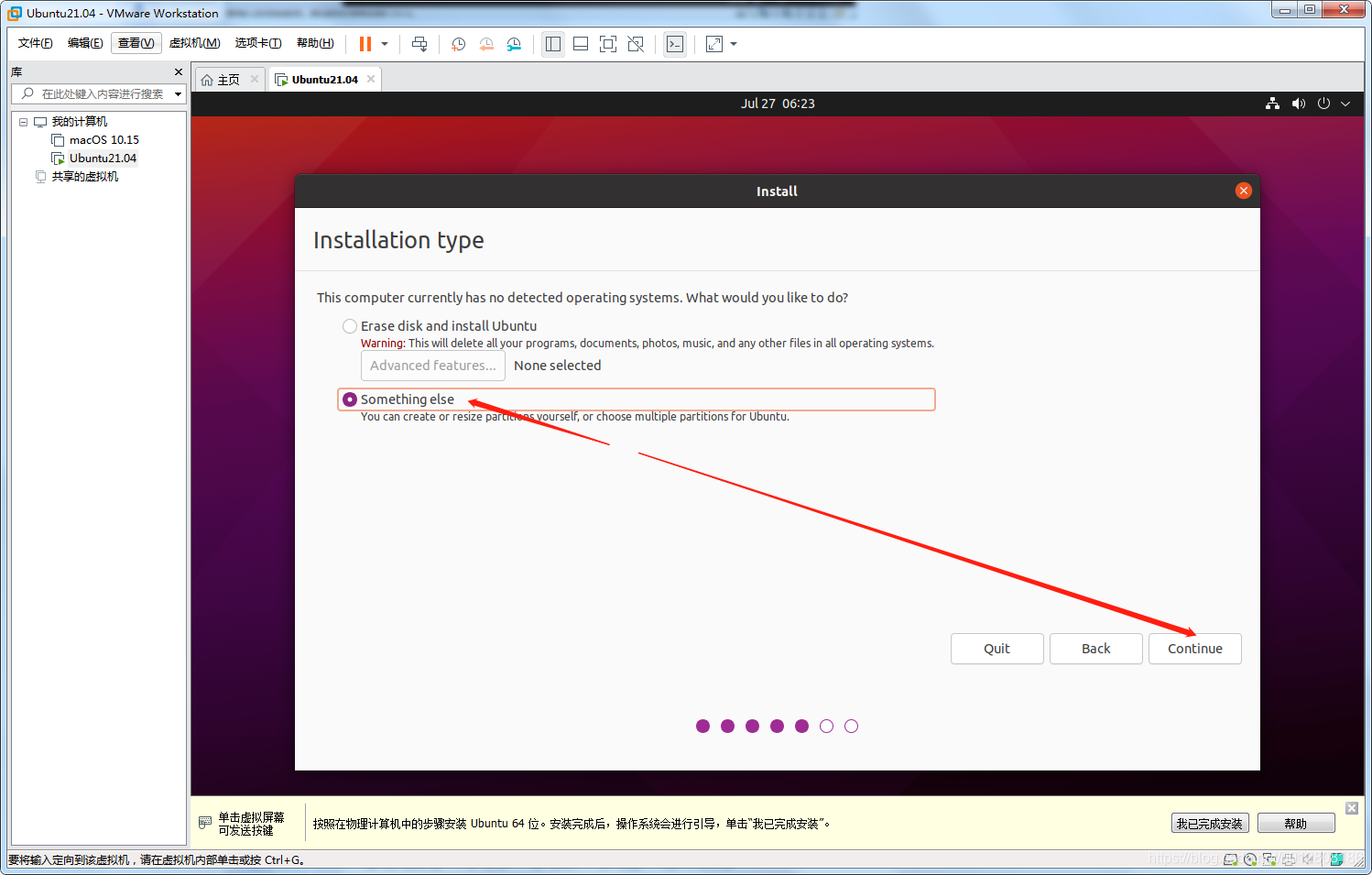 5、磁盘分区,这里准备手动分区,选择“Something else”(其他选项),continue。