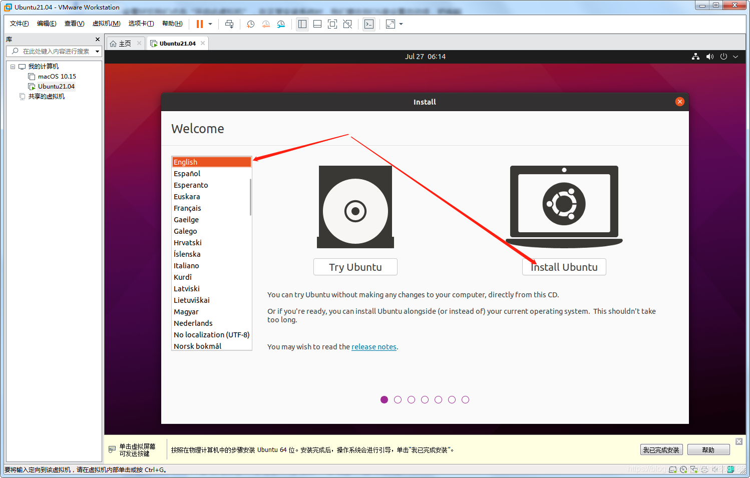 一、下载方式:(推荐使用网易镜像站下载,官网下载速度太慢)在官网下载ubuntu:网址:https://ubuntu.com/download/desktop在网易镜像站下载ubuntu:网址:http://mirrors.163.com/ubuntu-releases/二、安装ubuntu:1、安装ubuntu前需要先自行下载安装VM虚拟机。2、选择语言为英语,安装ubuntu。3、选择键盘为英