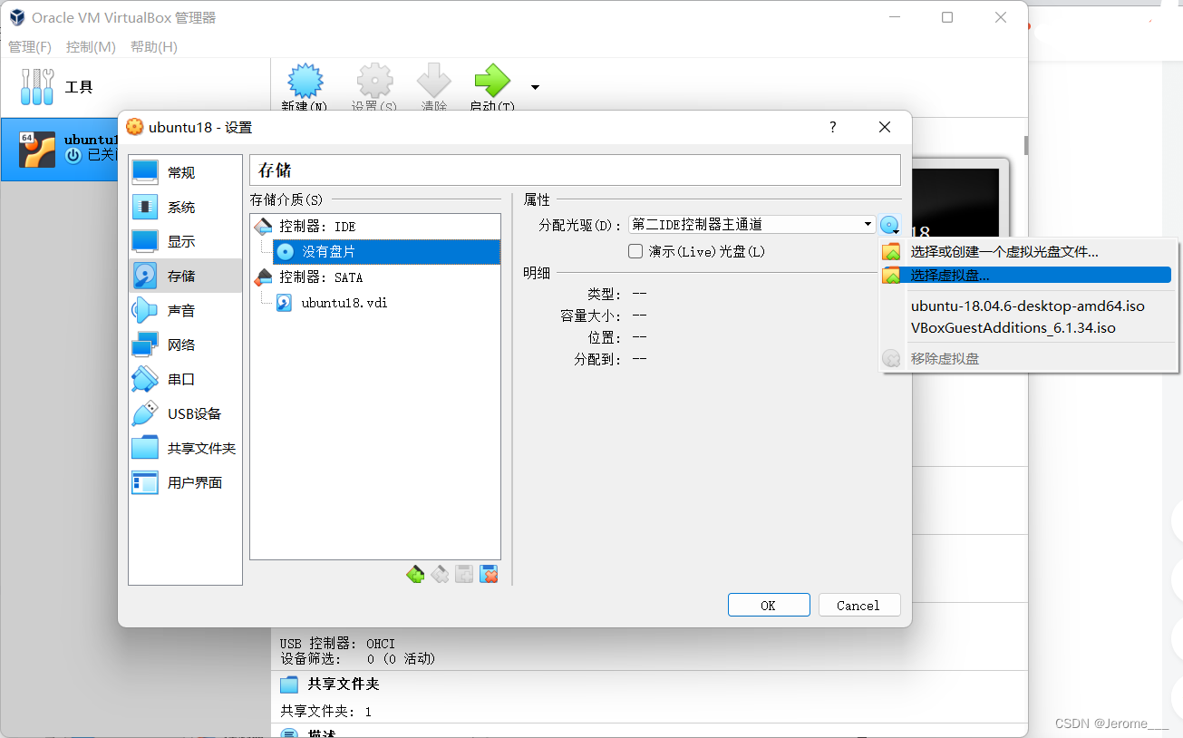 2、在设置界面,选择【存储】,在【控制器:IDE】下添加盘片:点击【分配光驱】中右边小光盘形状图标,点击【选择虚拟盘】,将之前下载好的Ubuntu版本ISO文件,添加进来即可。
