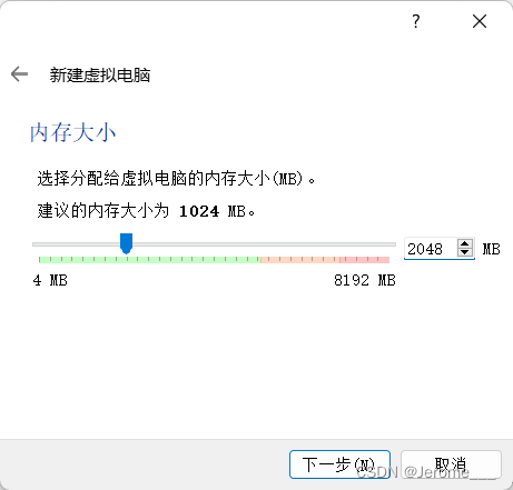 4、选择分配给虚拟电脑的内存大小,如果本机电脑内存充足,一般建议选择2048MB(即2G)及以上。