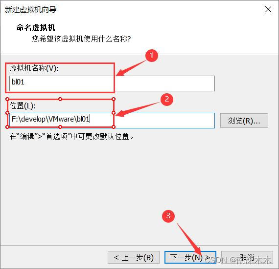 (5) 创建虚拟机名称和选择安装位置。建议放在容量较大的盘符里,文件会比较大,下一步。