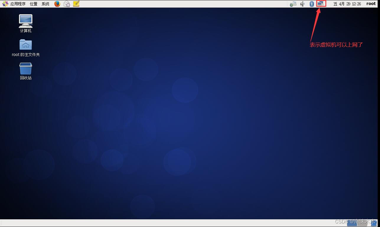 (38) 进入界面后,右上角的电脑图标显示如下图所示,说明虚拟机已经连上网络了。恭喜到此为止,所有的配置完成,可以使用虚拟机了。