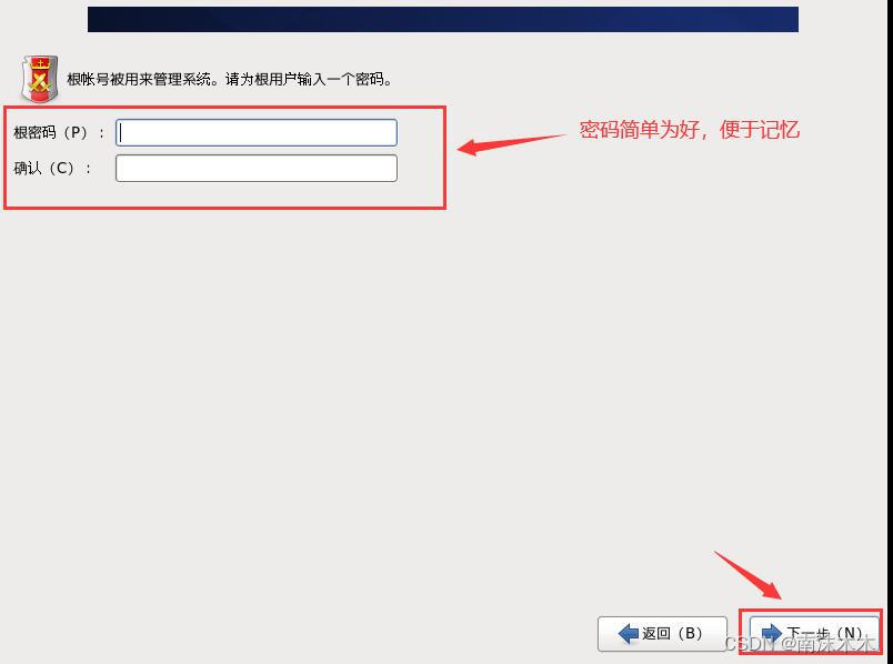 (24) 输入根用户(root)的密码,建议简单为好,便于记忆,下一步。