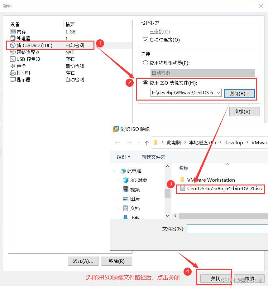 (8) 点击新CD/DVD配置映像文件,配置下载好的CentOS映像文件路径后,点击关闭。