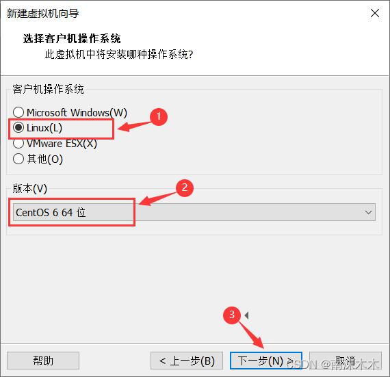 (4) 选择客户机操作系统:Linux;版本选择CentOS 64位,下一步。