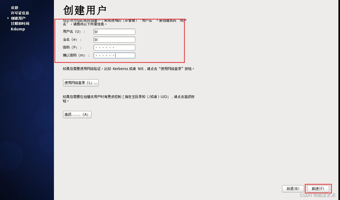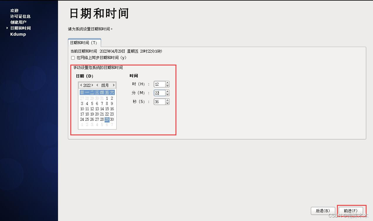 (34) 设置日期和时间,可以勾选在网络上同步日期时间,也可以手动设置,点击前进。