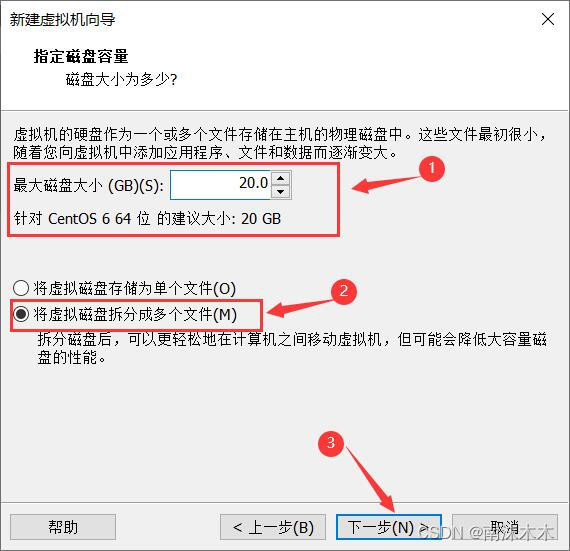 (6) 磁盘容量,一般默认20G,也可根据需求设置;选择将磁盘拆分成多个文件,下一步。