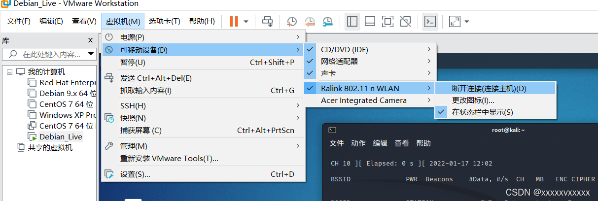 针对kali在监听过程中扫描不到附近WiFi,如下图步骤:1.先断开网卡的连接,再重新连接确保你的网卡是连接到虚拟机里2..