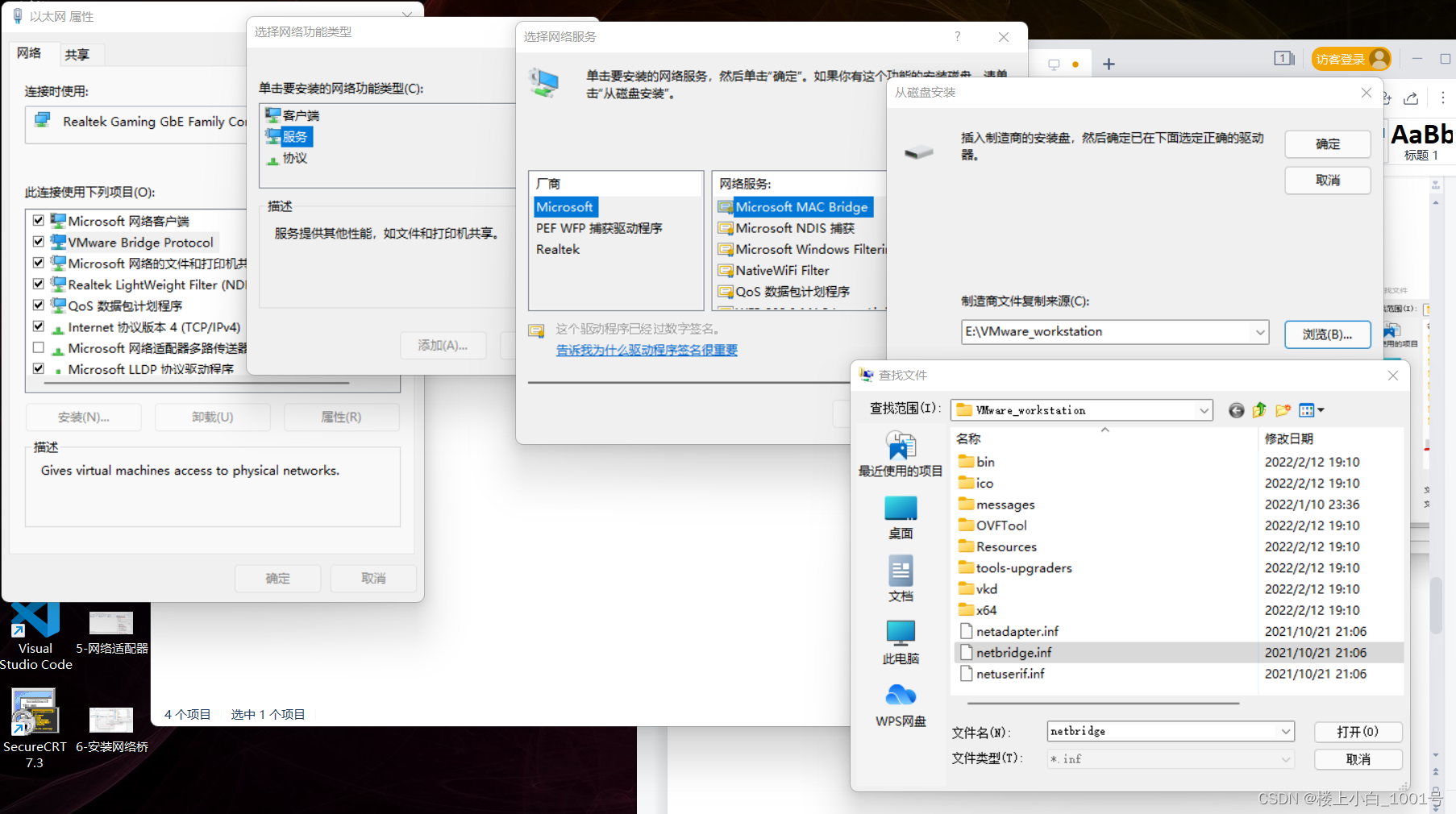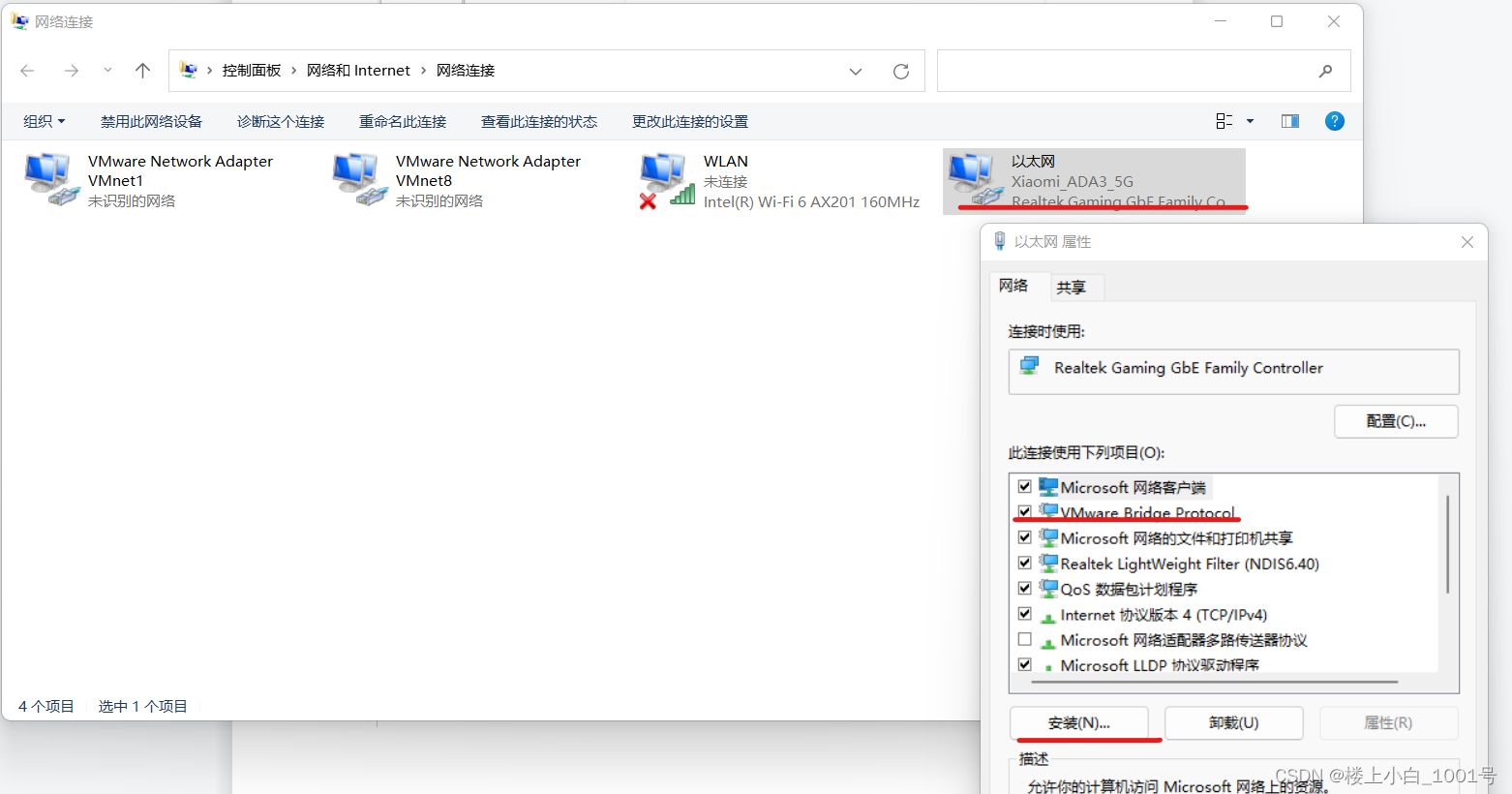 1、打开网络适配器,控制面板->网络和Internet->网络连接,如图所示,右键选中以太网,点击安装选中VMware Bridge Protocol->点击安装->选中服务-点击添加->从磁盘安装->点击浏览->选中netbridge.inf->打开,完成安装。