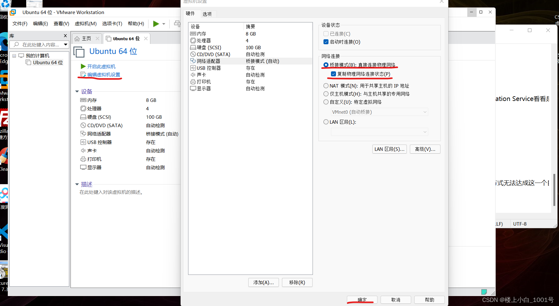 1、打开虚拟机,点击编辑虚拟机设置->网络适配器->选中桥接模式和复制物理网络连接状态。