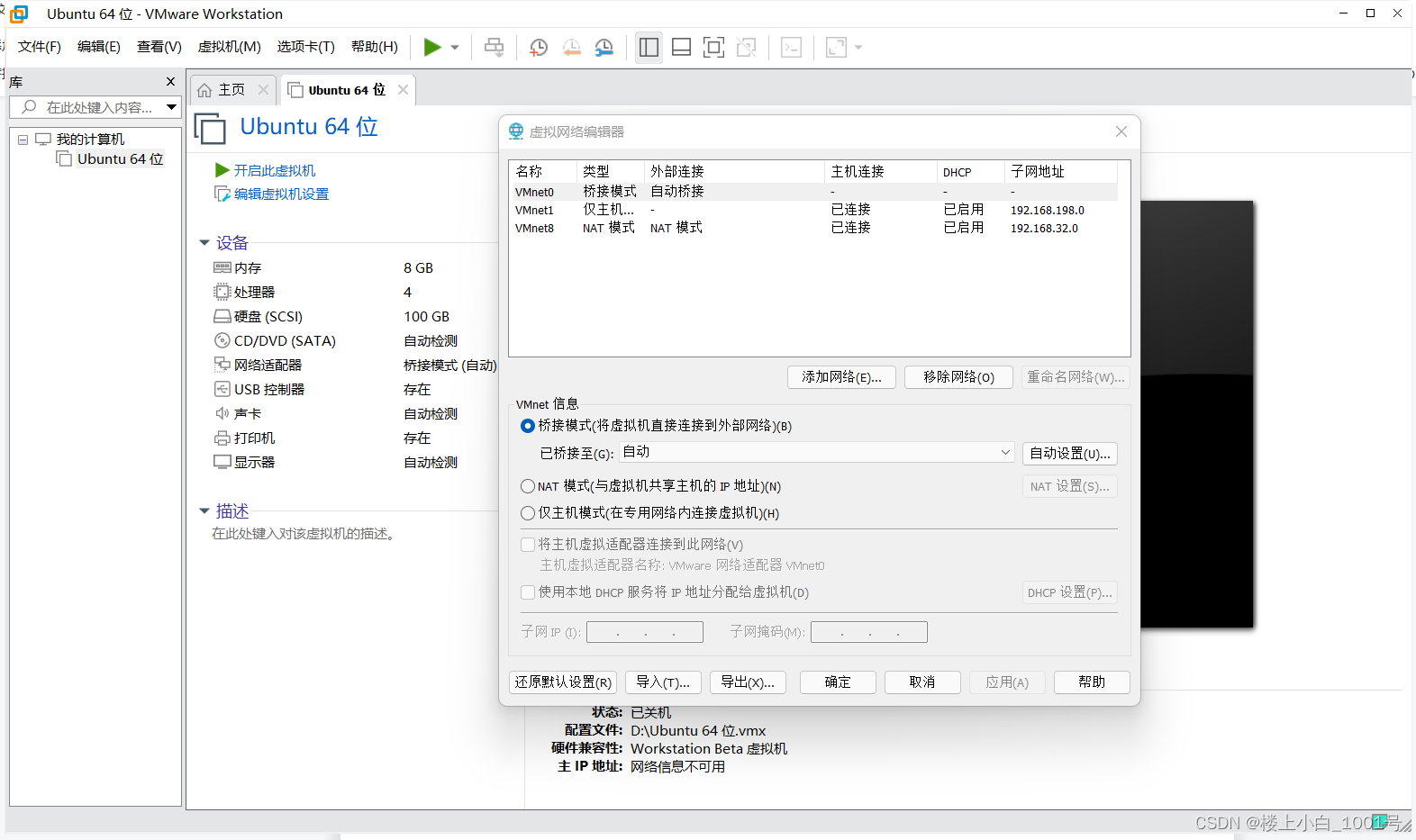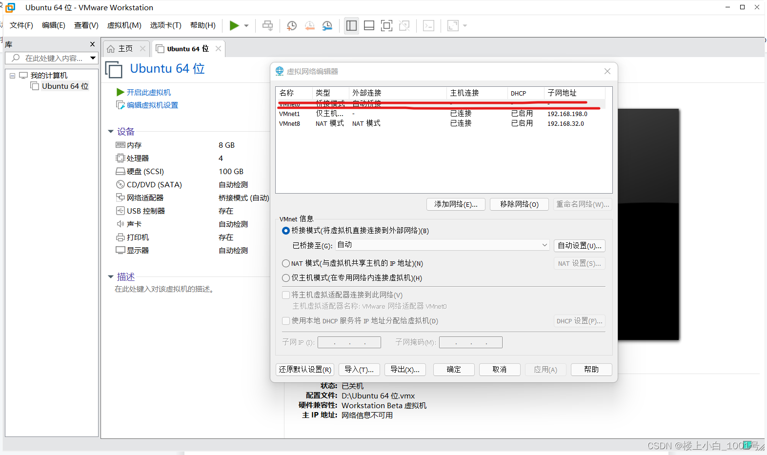 一般来说做完以上步骤,虚拟机便可以以桥接模式与虚拟机进行连接了。但这边在实际操作的时候遇到了以下问题:就是打开虚拟网络编辑器时,只能看到VMnet1和VMnet8的网卡,没有VMnet0的网卡,点击添加网络VMnet0后,选中桥接模式时,出现弹窗提示“无法将网络更改为桥接模式:没有未桥接的主机网络适配器”。