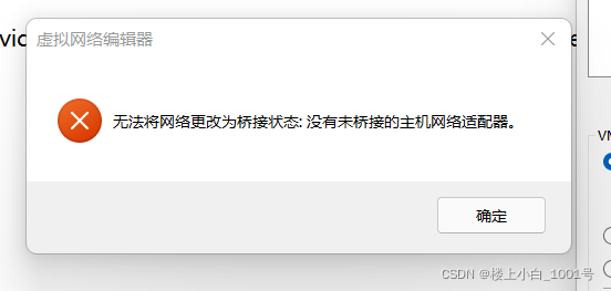 二、解决添加网络VMnet0后,选中桥接模式时,出现弹窗提示“无法将网络更改为桥接模式:没有未桥接的主机网络适配器”的问题。