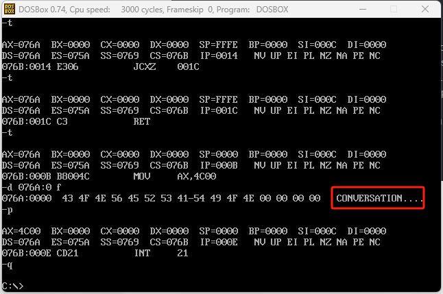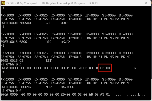 由以上可以看出,执行ret命令后,(IP)=0,CS:IP指向代码段的第一条指令。