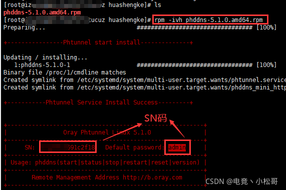 进入该目录后,使用命令:huashengke]# rpm -ivh phddns-5.1.0.amd64.rpm,就可以下载安装Linux版花生壳,如下: