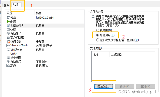 问题目录1、在物理机建立一个共享文件夹(路径可以考虑在D盘或者E盘都可以)2、启动kali系统,打开 菜单栏中 ---虚拟机----设置----选项----3、文件共享默认是禁用选项,选择“总是启用”,然后添加共享文件路径4、启用此共享5、完成啦~~,最后可以在kali系统中验证有此文件夹1、在物理机建立一个共享文件夹(路径可以考虑在D盘或者E盘都可以)2、启动kali系统,打开 菜单栏中 ---