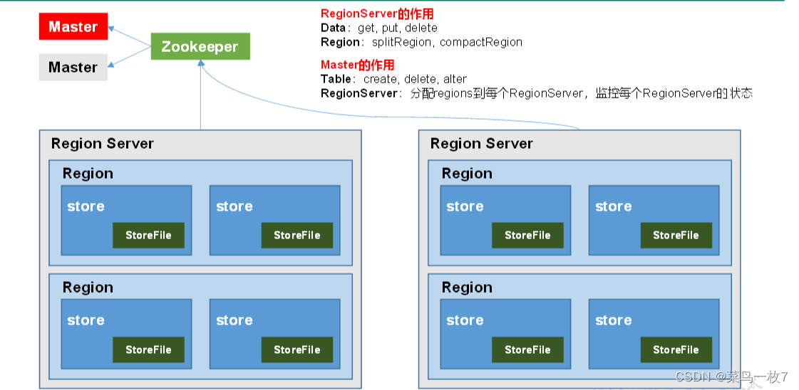 对于RegionServer的操作:分配regions到每个RegionServer,监控每个RegionServer的状态,负载均衡和故障转移。
