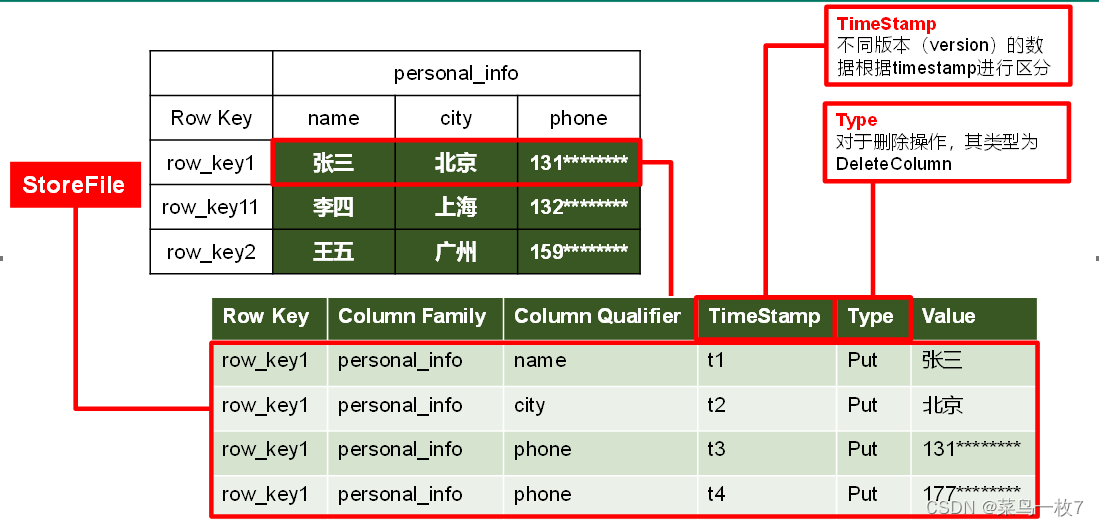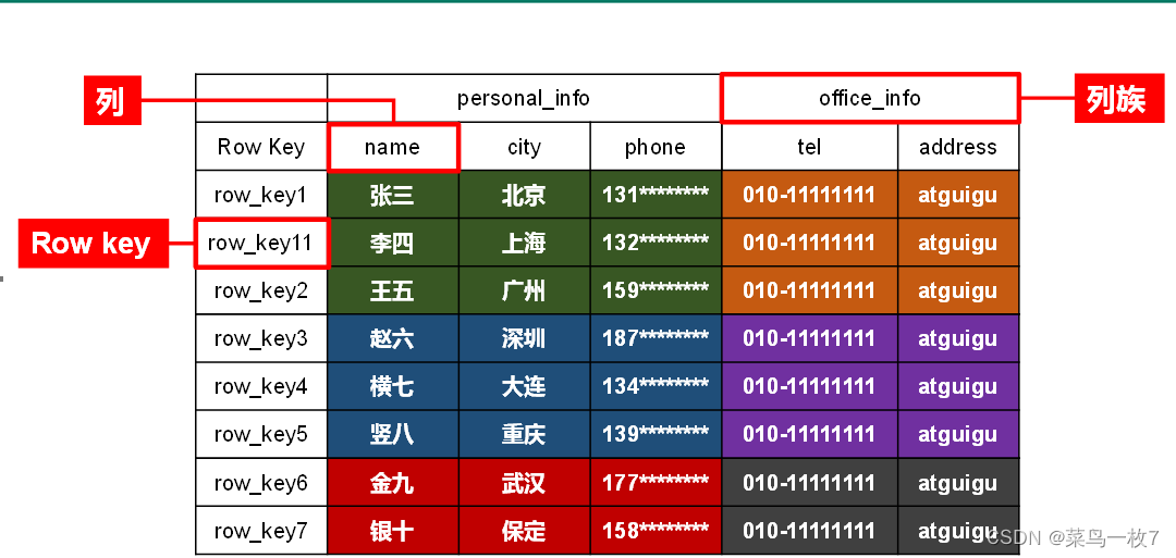 HBase中的每个列都由Column Family(列族)和Column Qualifier(列限定符)进行限定,例如info:name,info:age。建表时,只需指明列族,而列限定符无需预先定义。