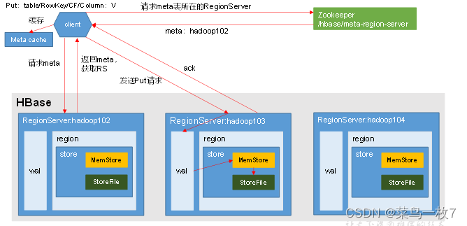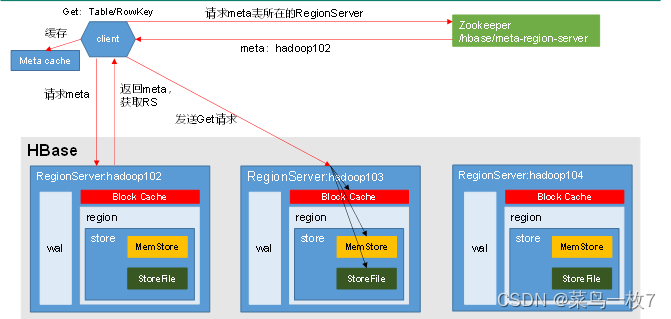 1)Client先访问zookeeper,获取hbase:meta表位于哪个Region Server。