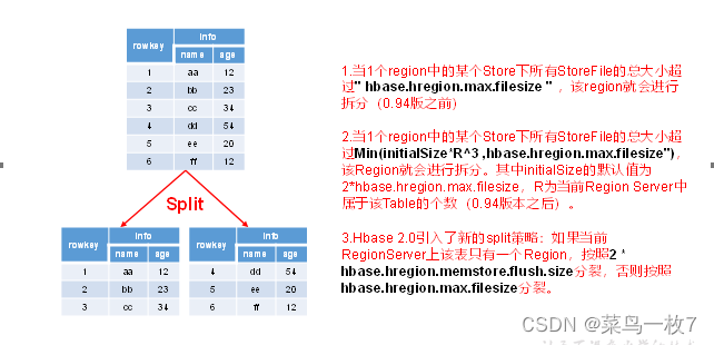 3.Hbase 2.0引入了新的split策略:如果当前RegionServer上该表只有一个Region,按照2 * hbase.hregion.memstore.flush.size分裂,否则按照hbase.hregion.max.filesize分裂。