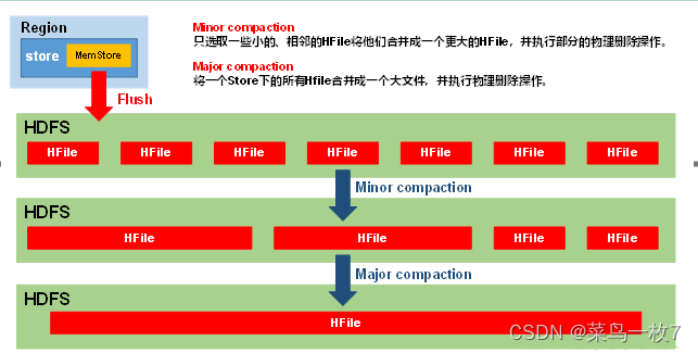 由于memstore每次刷写都会生成一个新的HFile,且同一个字段的不同版本(timestamp)和不同类型(Put/Delete)有可能会分布在不同的HFile中,因此查询时需要遍历所有的HFile。为了减少HFile的个数,以及清理掉过期和删除的数据,会进行StoreFile Compaction。
