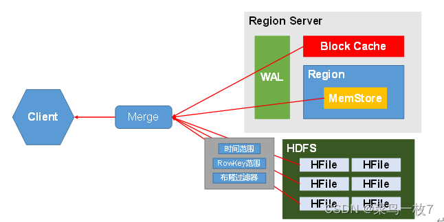 4)分别在MemStore和Store File(HFile)中查询目标数据,并将查到的所有数据进行合并。此处所有数据是指同一条数据的不同版本(time stamp)或者不同的类型(Put/Delete)。