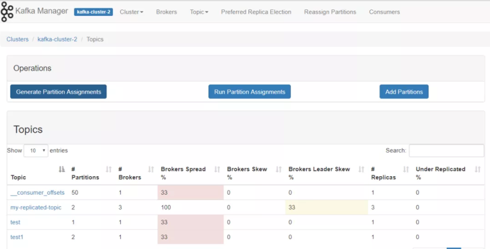 为了简化开发者和服务工程师维护Kafka集群的工作,Yahoo构建了一个叫做Kafka管理器的基于Web工具,叫做 Kafka Manager,目前Kafka Manager已更名为CMAK。这个管理工具可以很容易地发现分布在集群中的哪些topic分布不均匀,或者是分区在整个集群分布不均匀的的情况。它支持管理多个集群、选择副本、副本重新分配以及创建Topic。